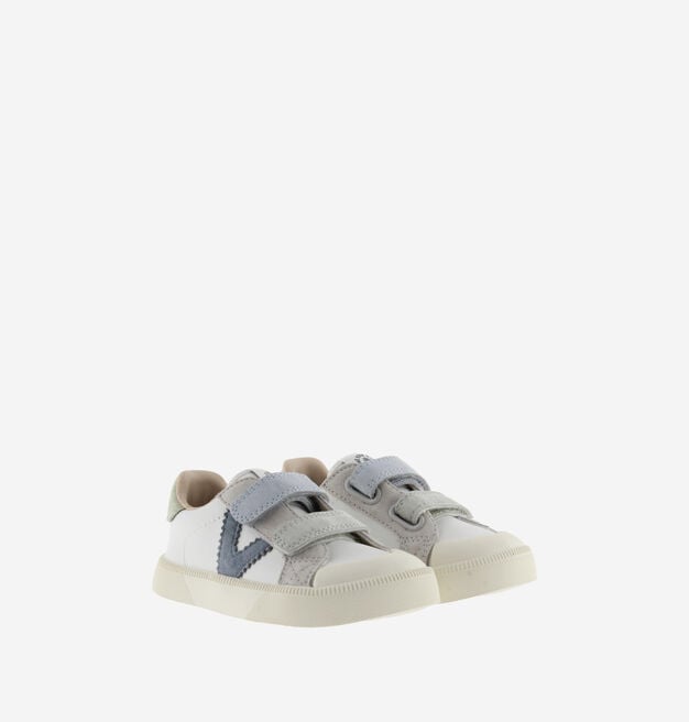 Sapatilhas desportivas barefoot para crianças fabricadas em efeito pele branca com peças multicolor de carmurça. Fecho de tiras aderentes que proporcionam maior fixação e facilitam o calce, incentivando a sua autonomia. Sola em TPR ligeiramente tostada com reforço na biqueira para maior resistência e durabilidade.