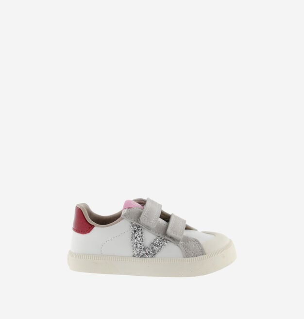 Sapatilhas desportivas barefoot para crianças, confeccionadas em material com efeito pele. Detalhe lateral em glitter prateado e toque de cor na parte traseira, para um look divertido e moderno. Fecho com duas tiras aderentes, que facilitam o calçar e garantem maior fixação. Sola de borracha ligeiramente ambarada, flexível e confortável, ideal para o movimento natural dos pés.